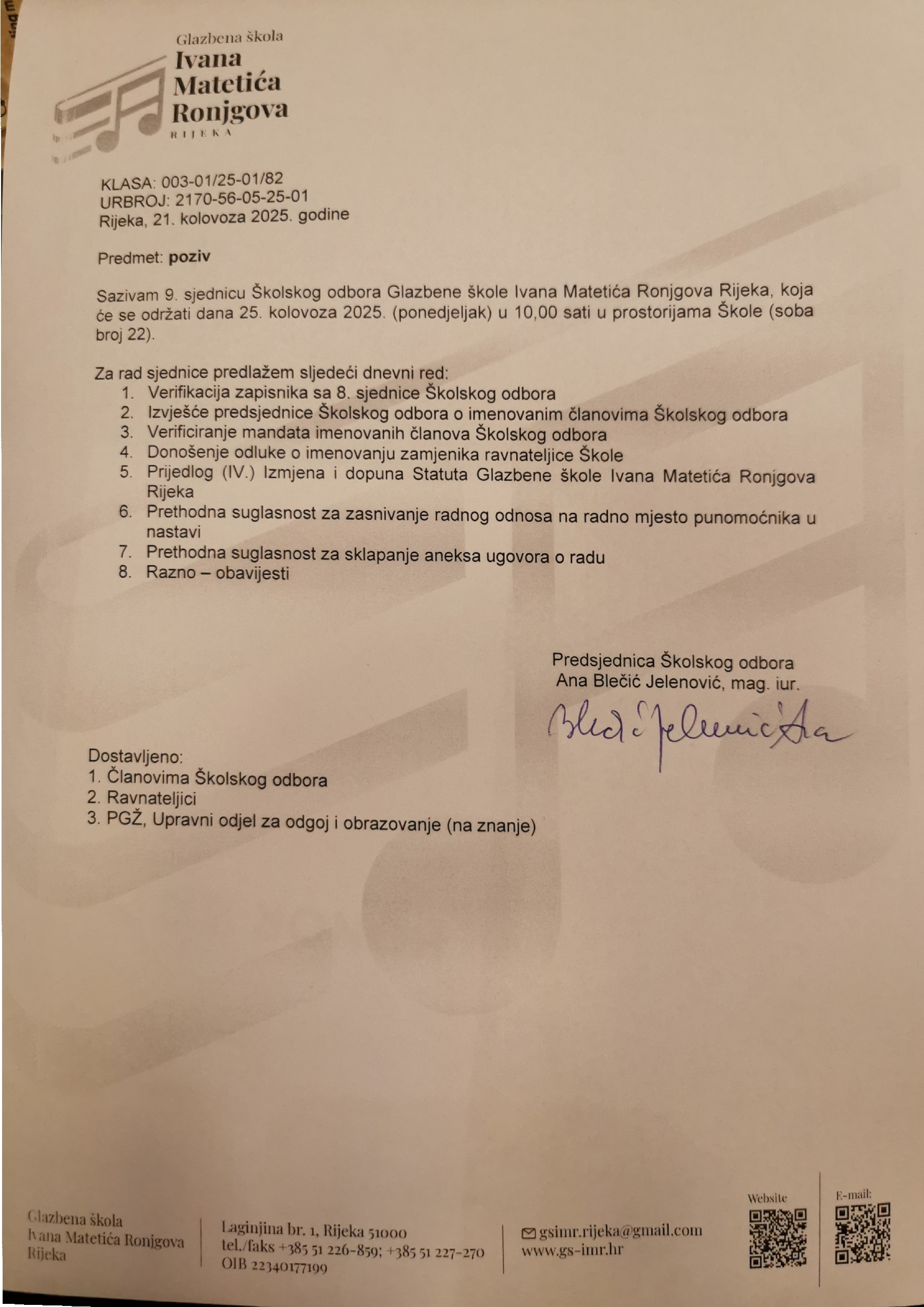 Školom upravlja Škoski odbor Glazbene škole Ivana Matetića Ronjgova Rijeka u sastavu: